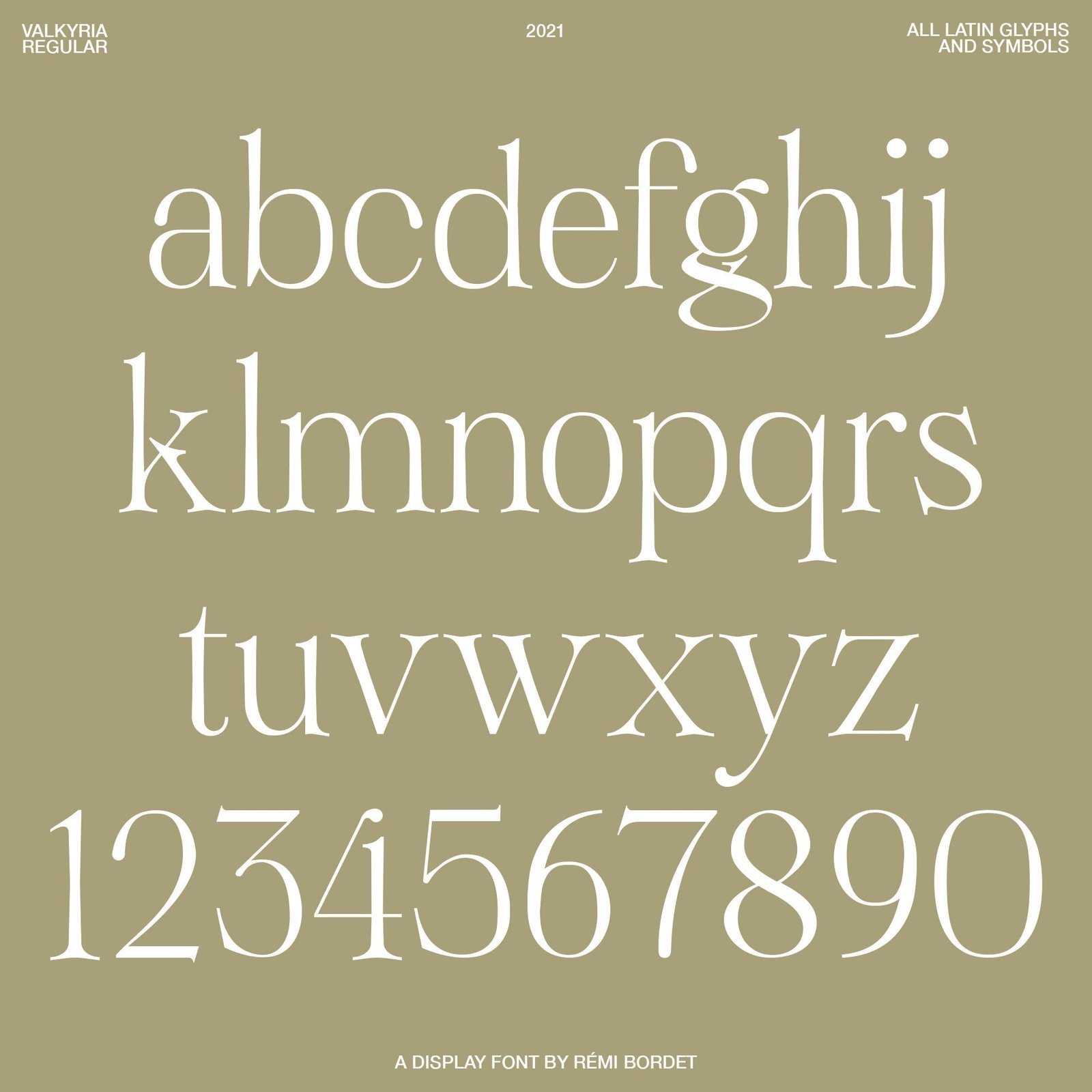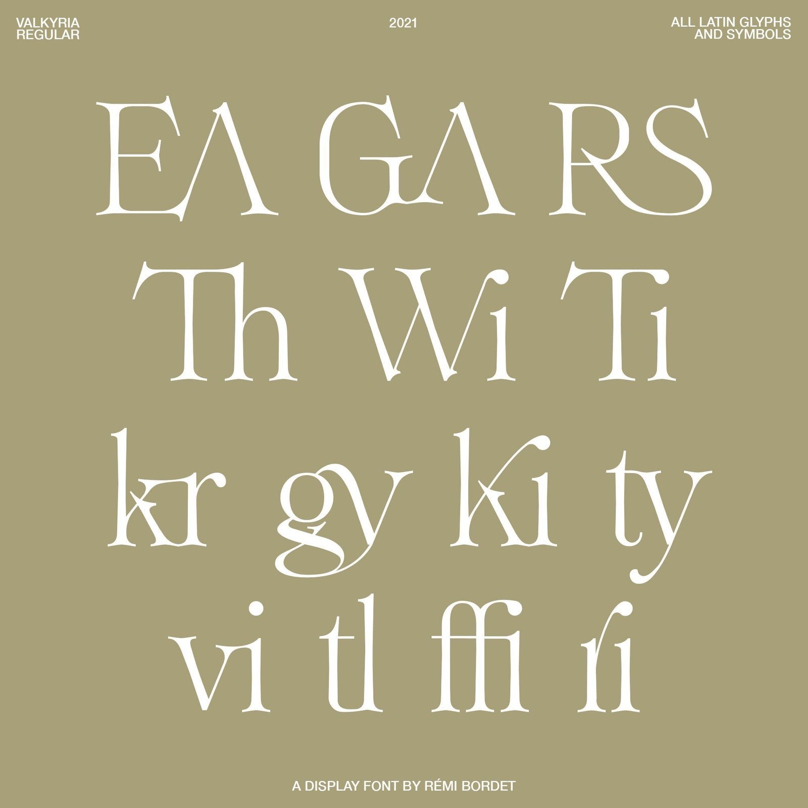 Valkyria is an elegant Latin font containing uppercase, lowercase, numbers, symbols and a bunch of ligatures to play with.