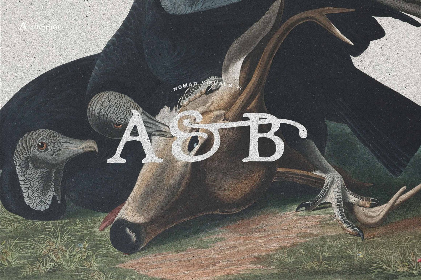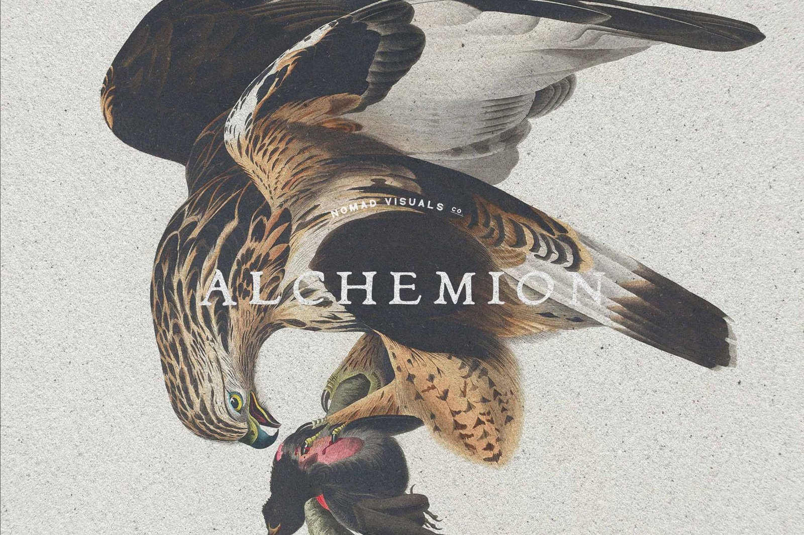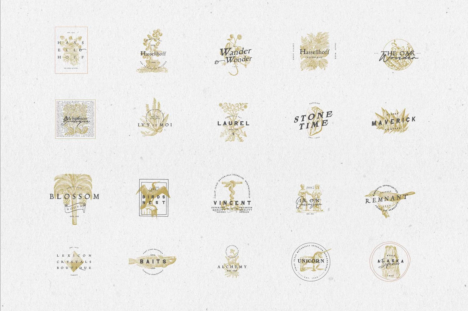 The package also includes 3 original display fonts (Alchemion, Laurel, Moses Aged) created specifically for this package of logos.