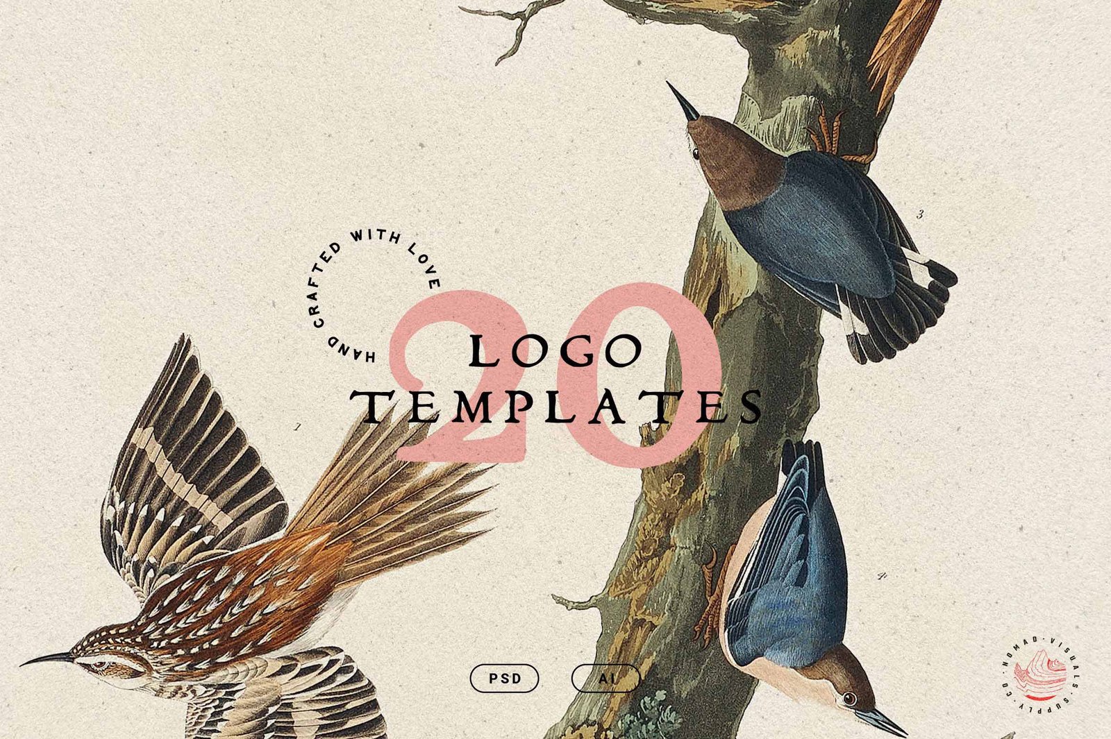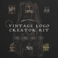 The Vintage Logo Creator Kit features 20 logo templates, 72 illustrations, 3 original fonts, and 20 extra elements to create beautiful and unique branding.